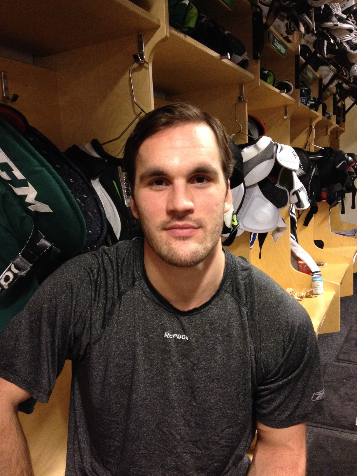 ”Ja, och jag har för mig att det var likadant på bortaplan. De ställer upp i mittzonen… De flesta lagen försöker ju passa ut på kanterna, och då täcker de där. Jag vet ju själv när man spelar boxplay; kommer en back upp täcker de andra spelarna eftersom man vill nästan att backen ska bära pucken. Oftast är inte de lika skickliga på det… Och jag bestämde mig för att ta chansen istället för att vänta! Har jag ingen att passa tar jag det själv!” Han ler lite.