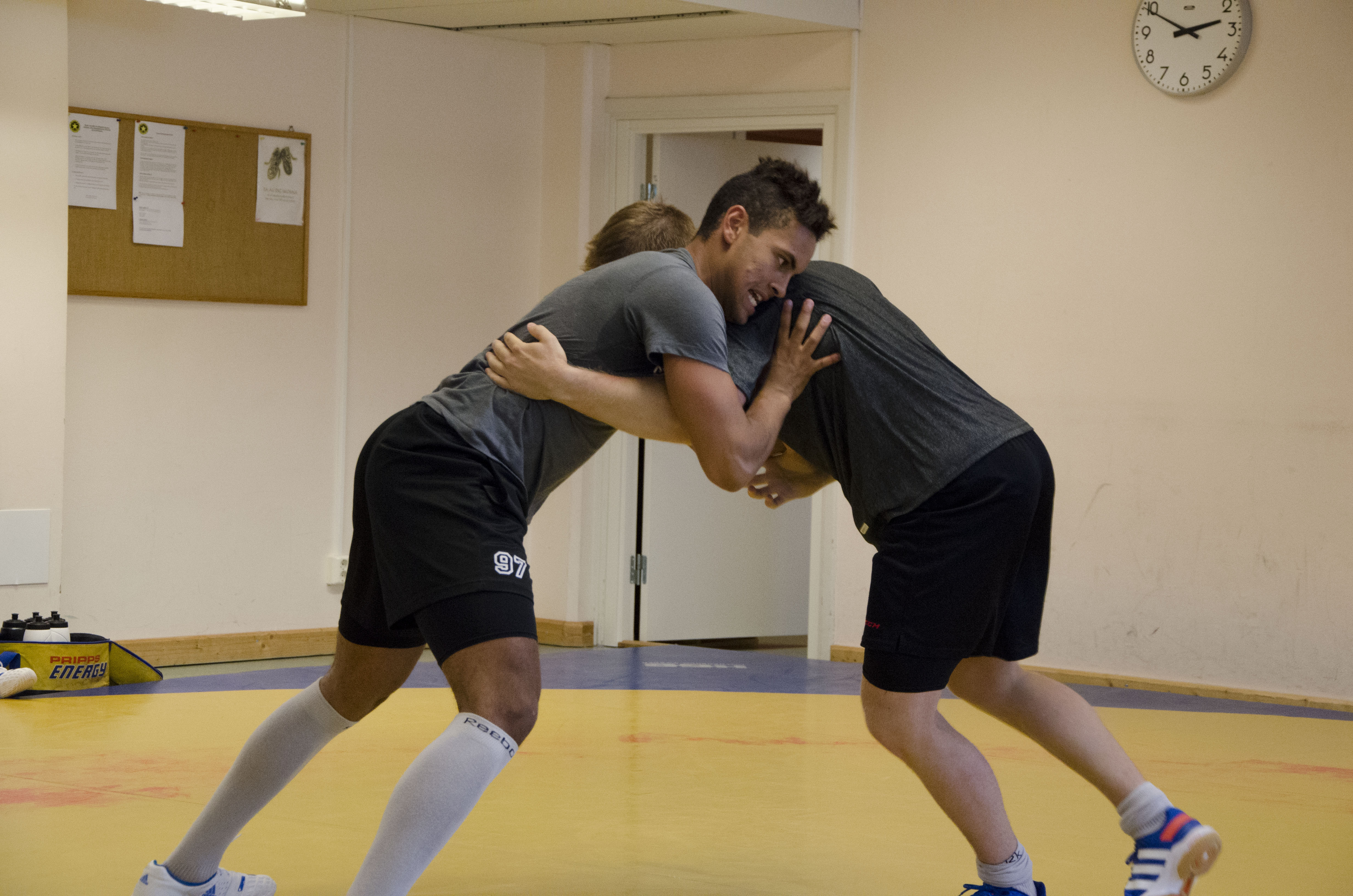 - Först en halvtimmes saftig uppvärmning… Allt under ledning av BK Orions brottningscoach Fredrik Hofmann