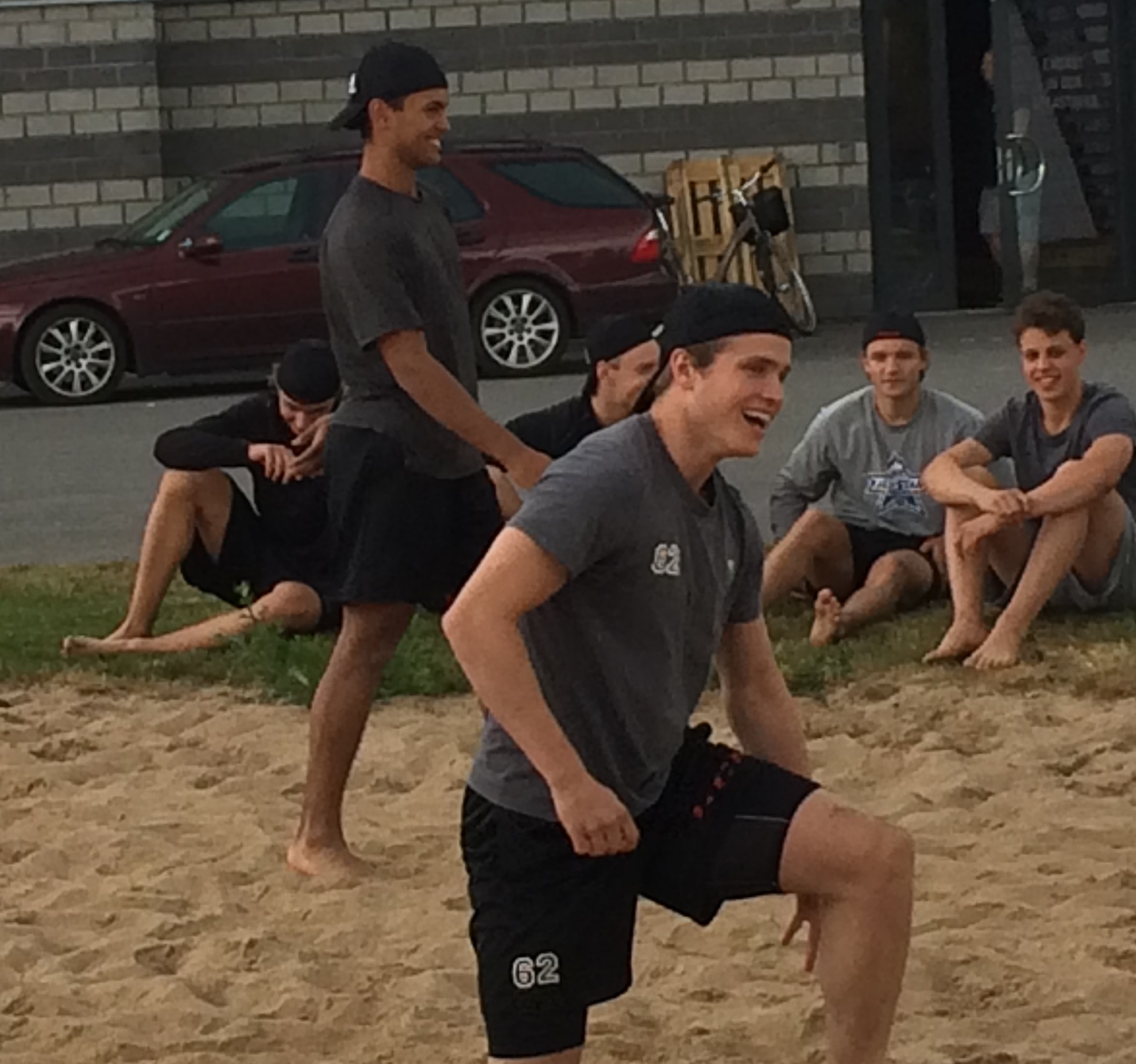 - Alexandra Skoog, Julia Pettersson, Ludwig Byström, Oliver Kylington, Frida Andersson, Sofia Jiglind, Sara Kask och Christoffer Forsberg förevigade efter beachvolleymatchen mellan damerna och herrarna. Foto: Robin Angle/fbkbloggen