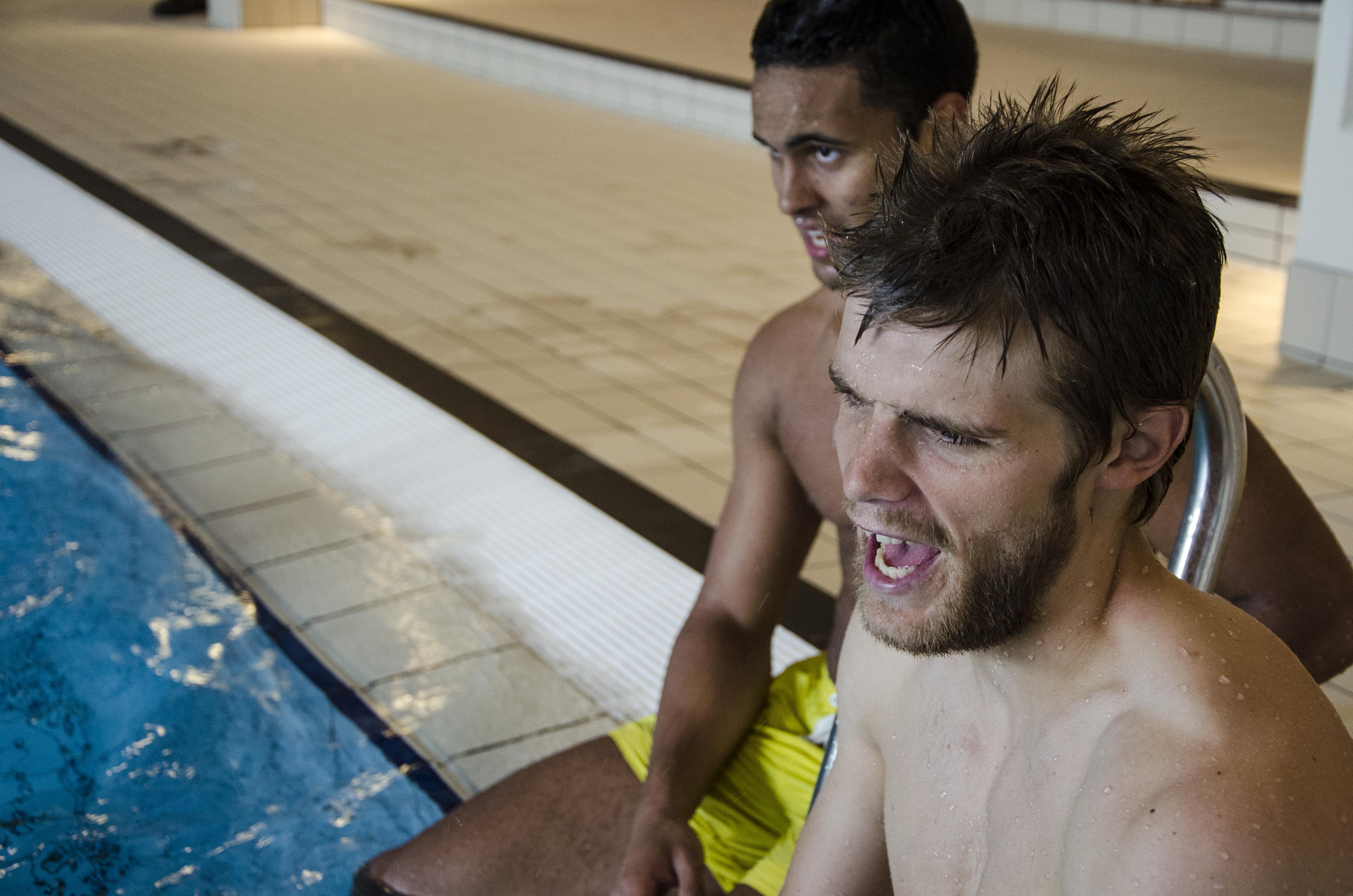 - Per Åslund under ett av sommarens mer oortodoxa träningspass: i simbassängen. Foto: Robin Angle/fbkbloggen