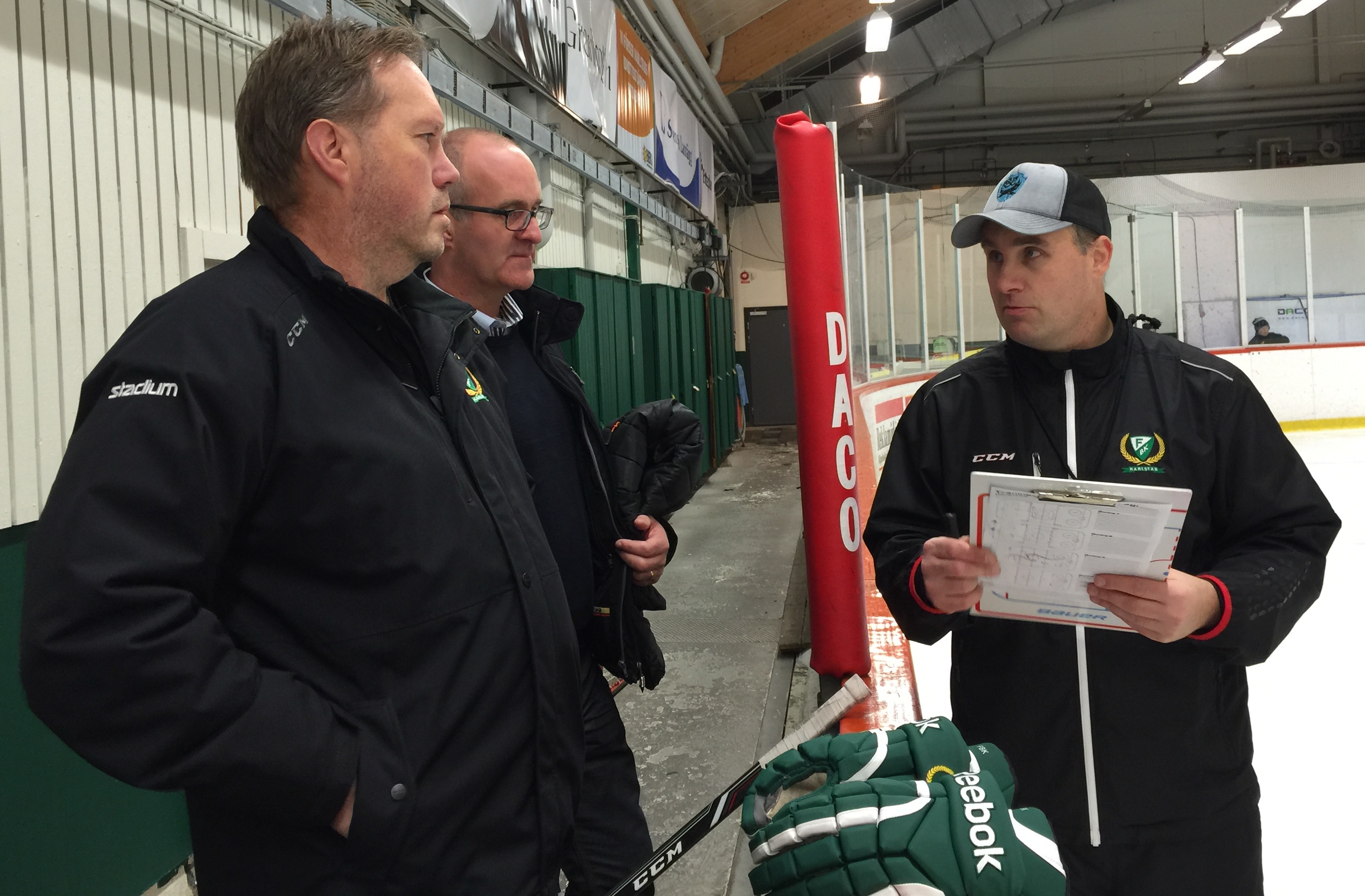 - Lagledaren L-G Sundgren, lagansvarige Mikael Pettersson och huvudtränaren Fredrik ”Kecke” Wilhelmsson i samspråk! Foto: Marie Angle/fbkbloggen