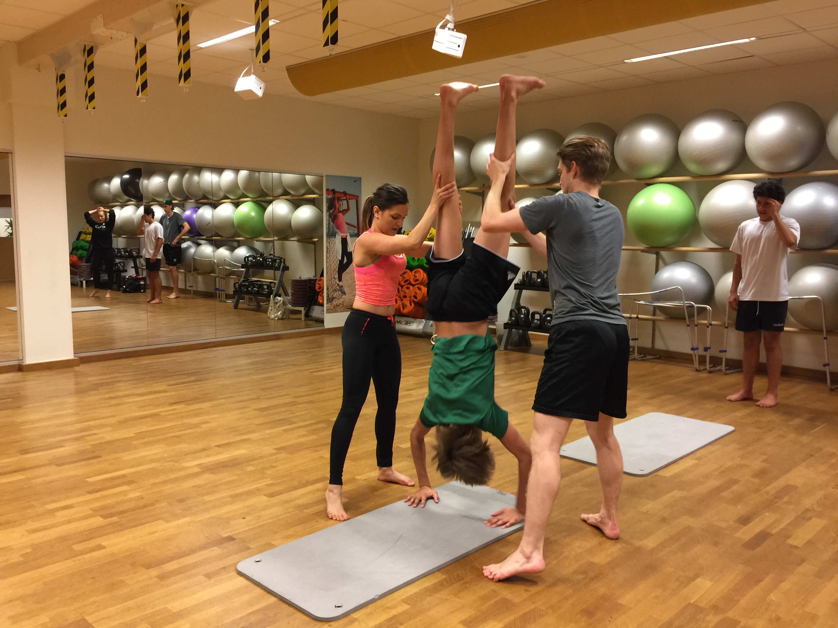 Tufft men roligt! Linda Glädt, Jonathan Höjd och Tom Hedin och de andra kan skratta när det blir lite dråpligt när hockey möter gymnastik… Foto: Marie Angle/fbkbloggen