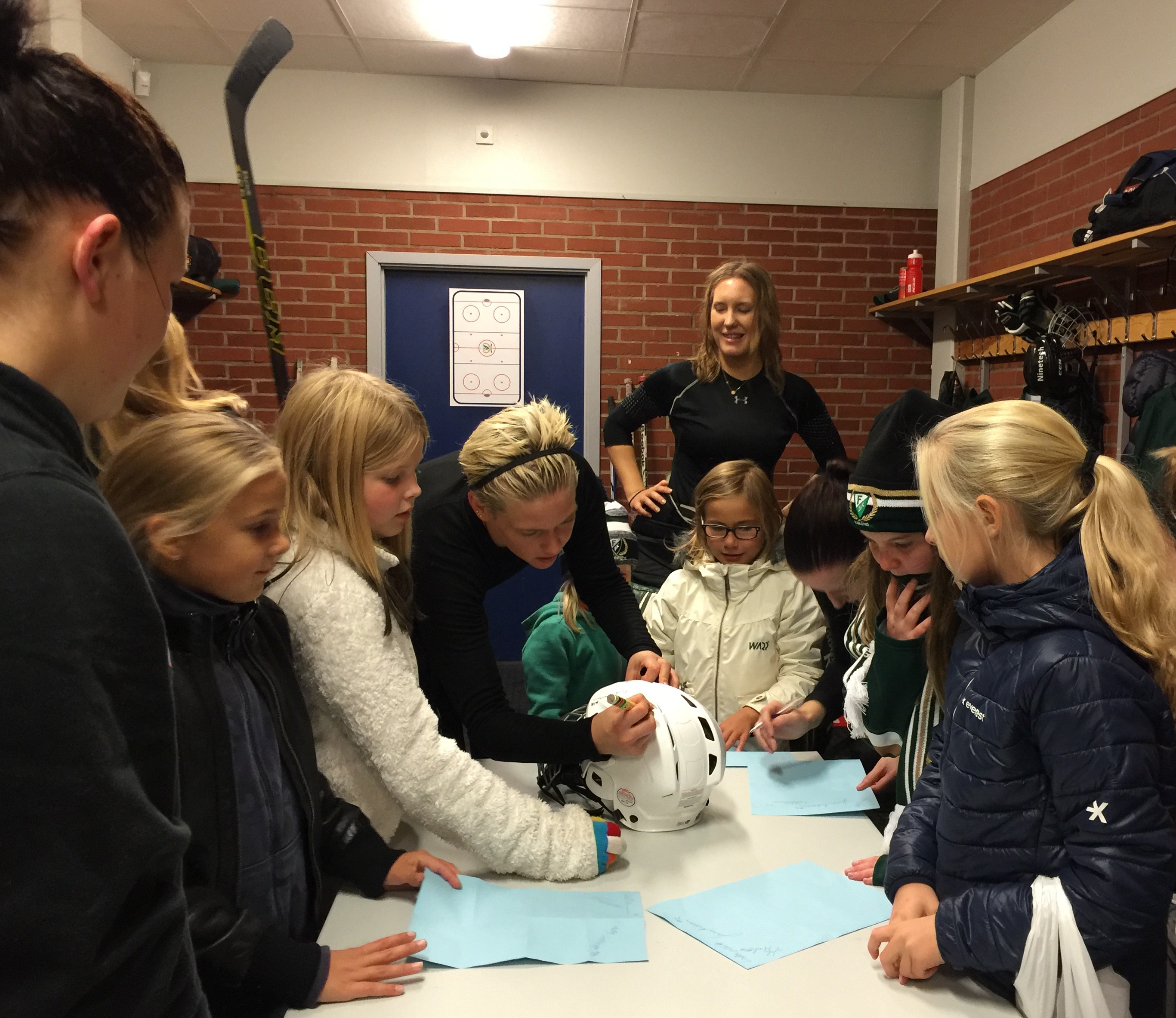 - Målskytten Daniella Carlsson skriver sin autograf på en ung beundrarinnas hjälm. Karin Åström övervakar i väntan på sin tur Foto: Marie Angle/fbkbloggen